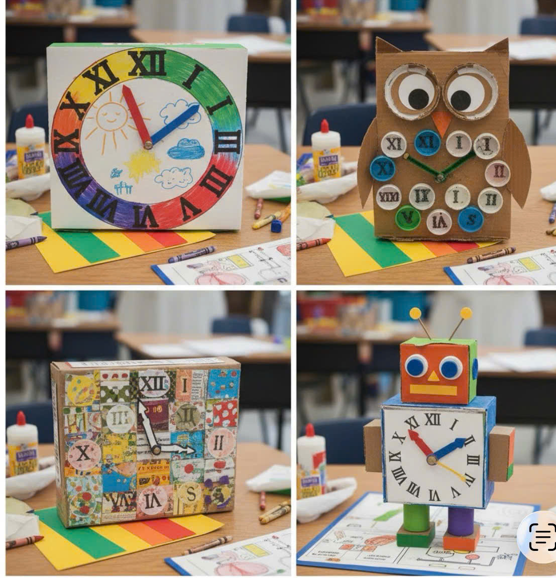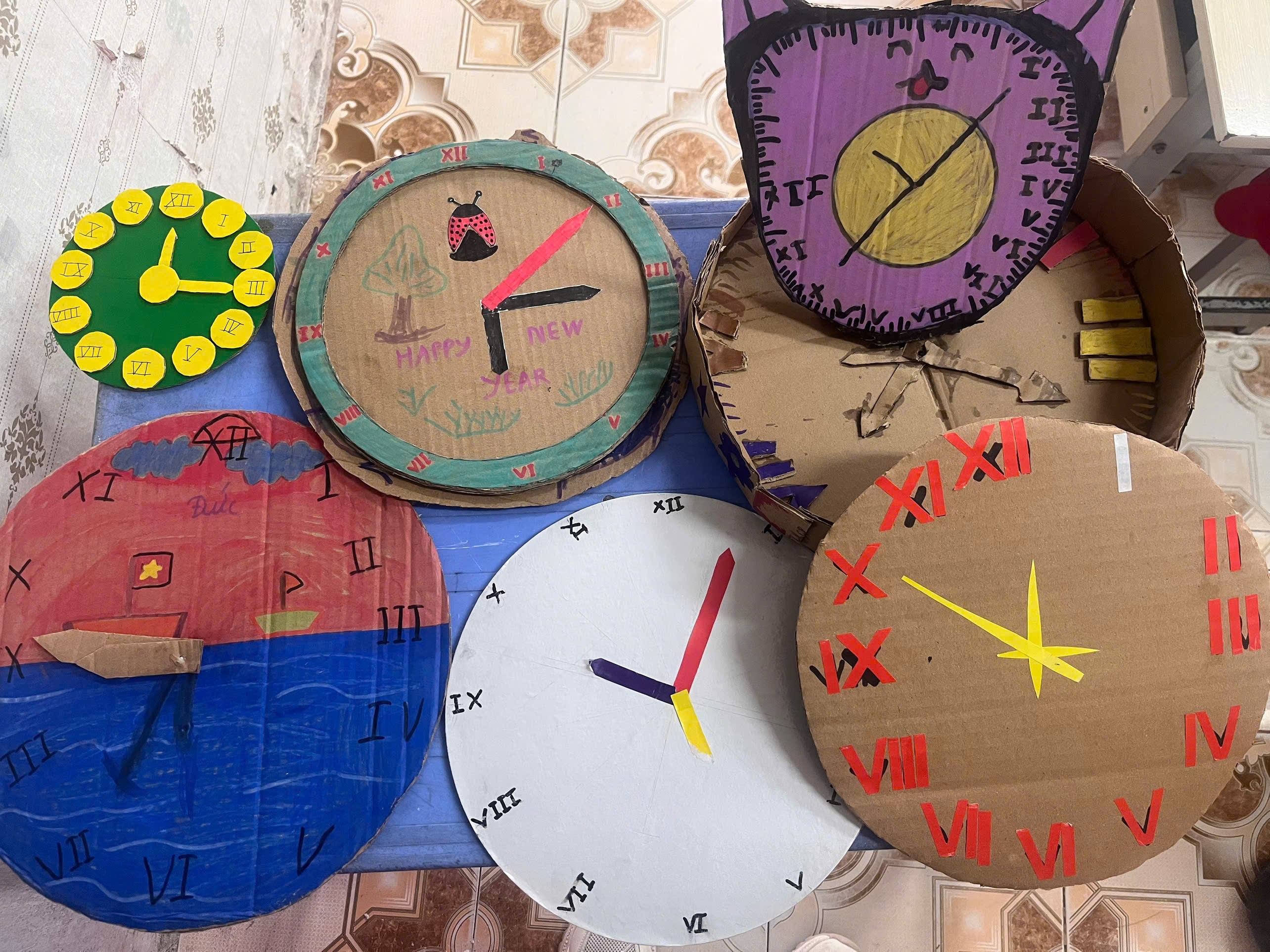Trong quá trình thực hiện, học sinh đã biết đo, vẽ hình tròn, chia mặt đồng hồ thành 12 phần bằng nhau, lắp kim giờ và kim phút đúng vị trí. Hoạt động này giúp các em vận dụng kiến thức Toán học vào thực tế, đồng thời rèn luyện sự khéo léo, cẩn thận và tinh thần làm việc nhóm.