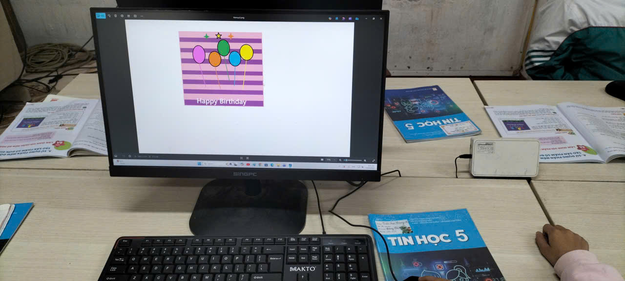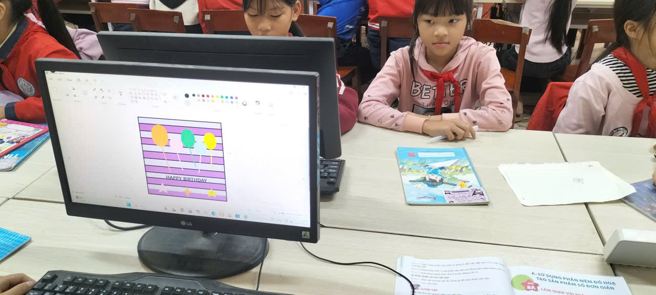 Trong tiết thực hành môn Tin học lớp 5 với nội dung “Sử dụng phần mềm đồ hoạ tạo sản phẩm số”, dưới sự hướng dẫn của giáo viên, học sinh được làm quen và sử dụng các công cụ cơ bản của phần mềm đồ họa Paint như: vẽ hình, tô màu, chèn hình khối, viết chữ và sắp xếp bố cục hình ảnh. Từ đó, các em tự thiết kế những sản phẩm số đơn giản, sinh động với chủ đề quen thuộc như thiệp chúc mừng sinh nhật, tranh trang trí với hình ảnh bóng bay và các họa tiết nhiều màu sắc.