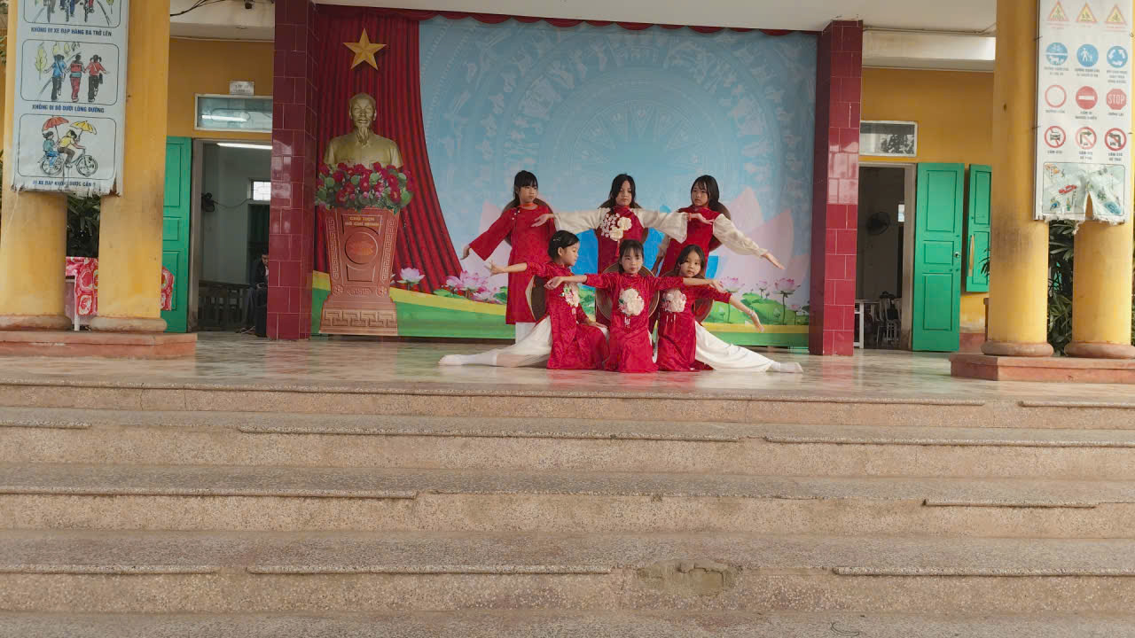 Xuất hiện trên sân khấu trong trang phục áo dài đỏ nổi bật, kết hợp cùng những chiếc nón lá duyên dáng, các em học sinh lớp 4C đã tự tin thể hiện những động tác múa mềm mại, uyển chuyển và đầy sức sống. Trên nền nhạc rộn ràng, tươi vui của bài hát “Việt Nam ơi”, từng bước múa nhịp nhàng, từng cử chỉ dứt khoát của các em đã tạo nên một tiết mục nghệ thuật sinh động, thu hút sự chú ý của toàn thể thầy cô và học sinh đang theo dõi dưới sân trường.